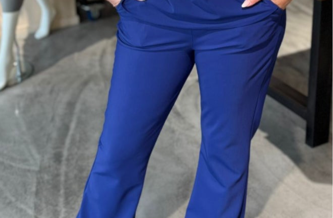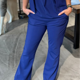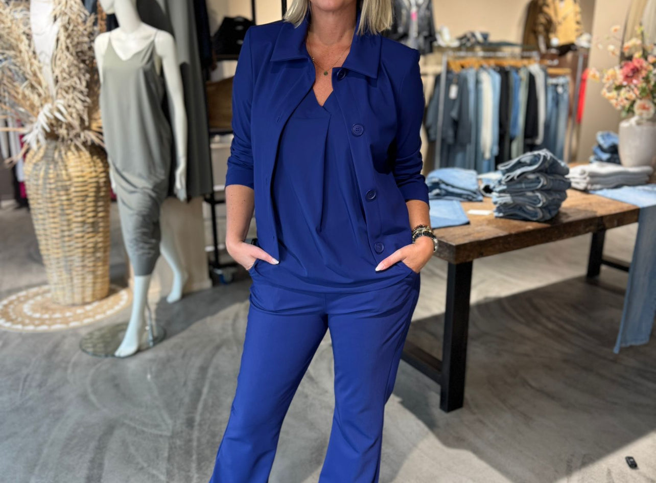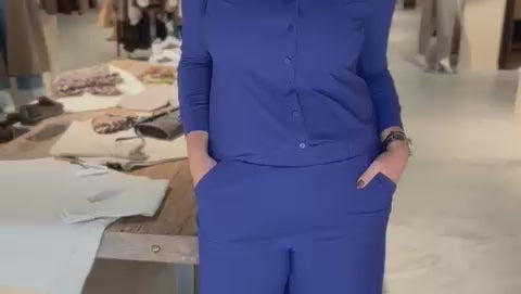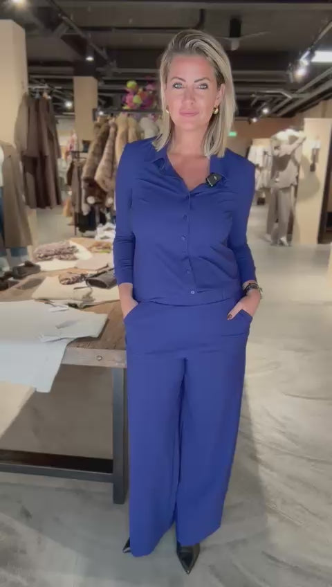 Deze inktblauwe broek voelt stevig maar flexibel aan dankzij de Bonded Travelstof, die bekendstaat om zijn rekbaarheid, vormvastheid en kreukvrije eigenschappen. Het materiaal is makkelijk te wassen en droogt snel, waardoor je de broek moeiteloos keer op keer kunt dragen. De flared fit geeft een vrouwelijke, elegante lijn, terwijl de elastische tailleband en riemlussen zorgen voor extra comfort en stylingopties.