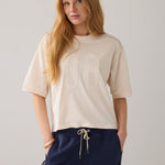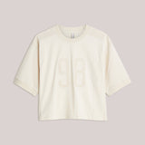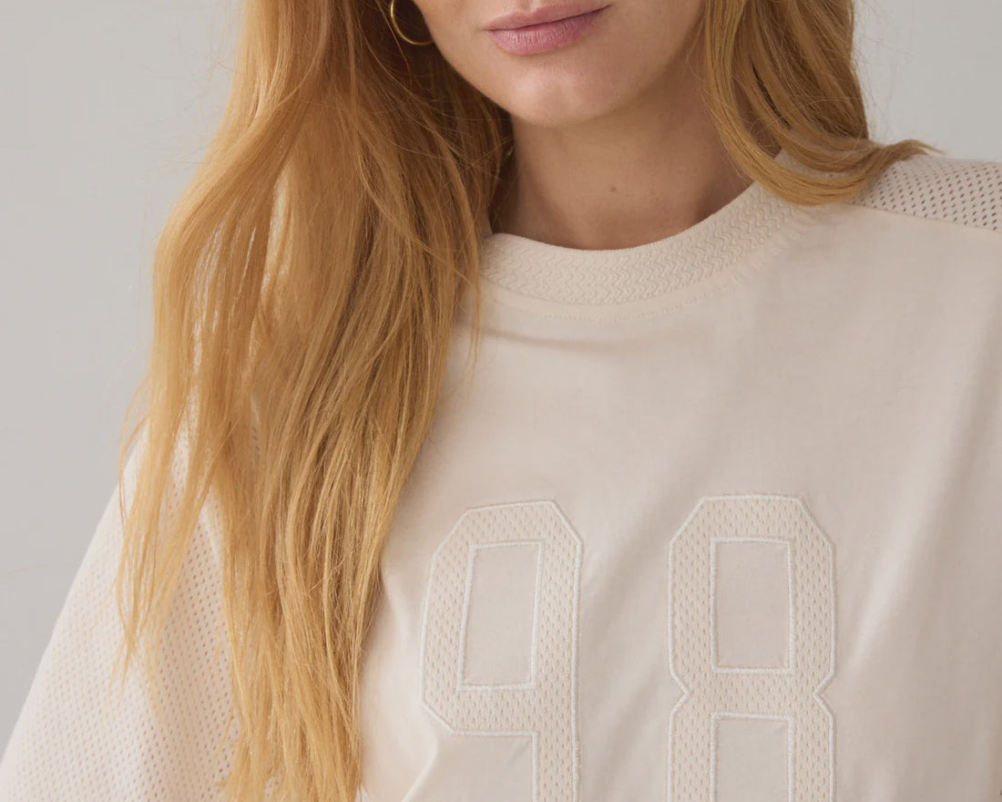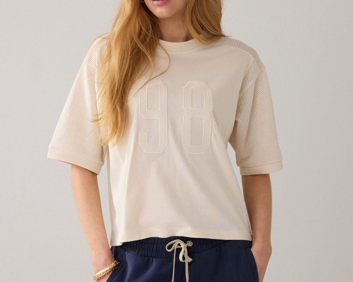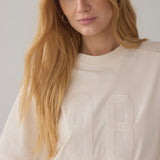 Dit gave t-shirt in ecru is een beetje boxy fit en is opengewerkt op de schouders en de zijkanten.