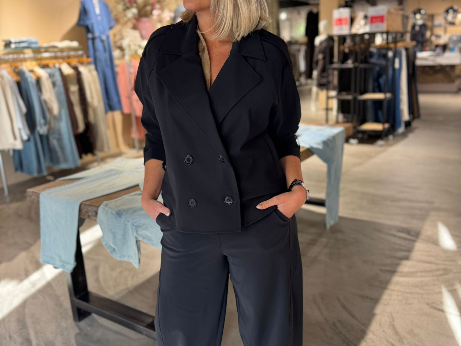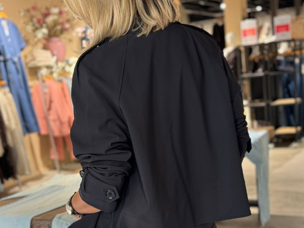 Gave korte trench in de basis bonded travelkwaliteit. Het ideale jasje, nu in het zwart.
