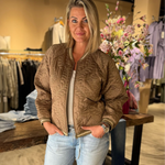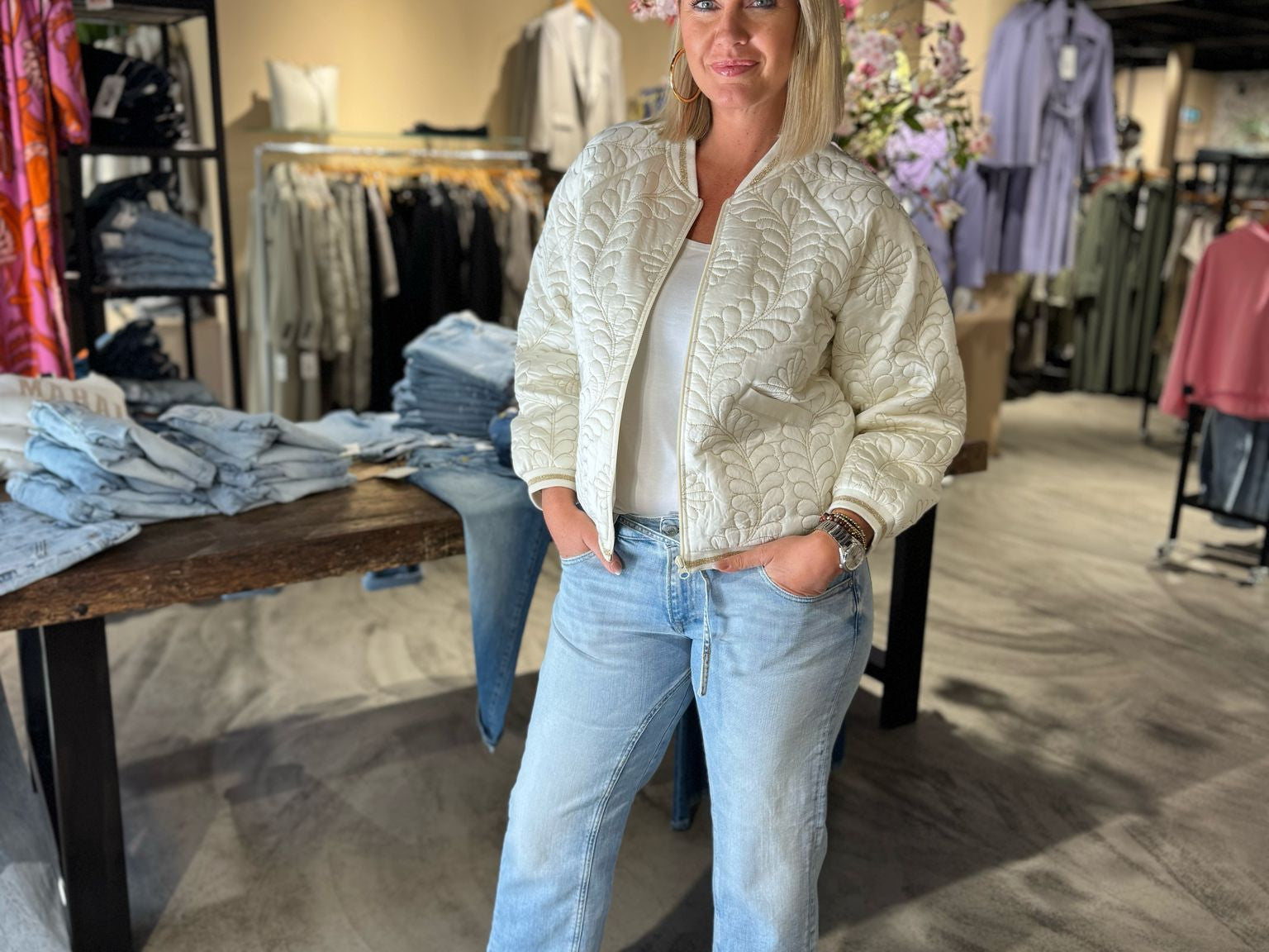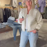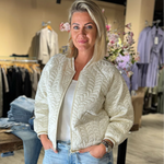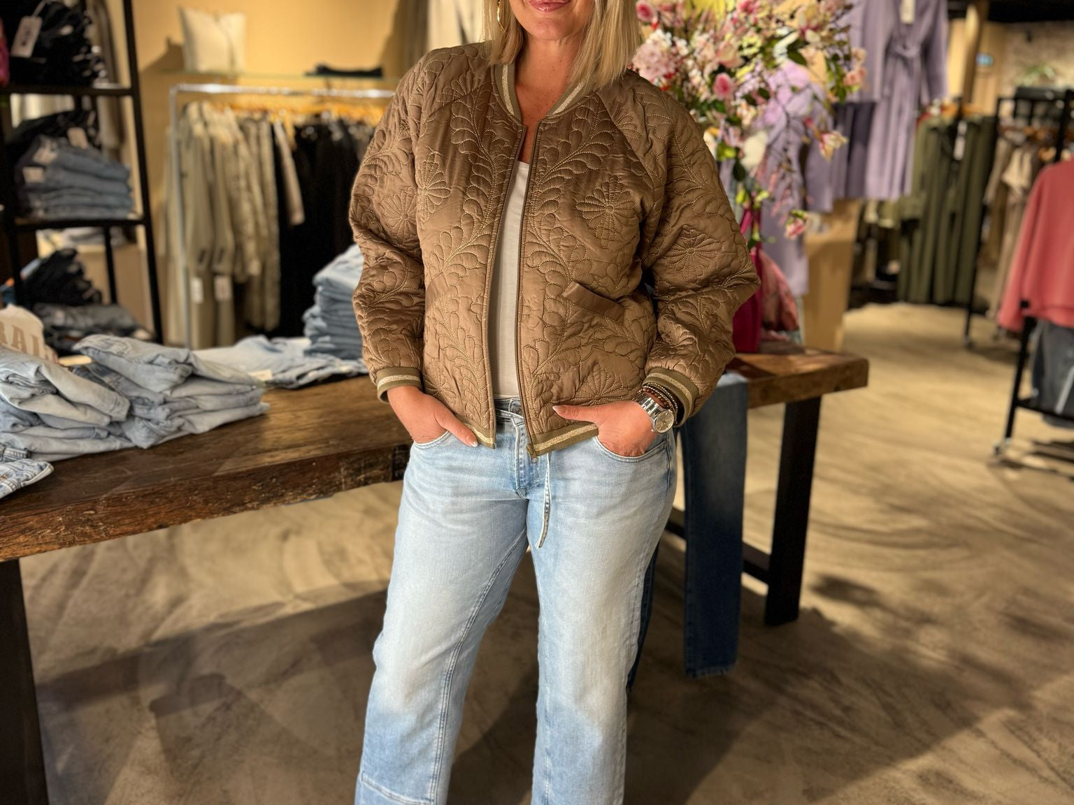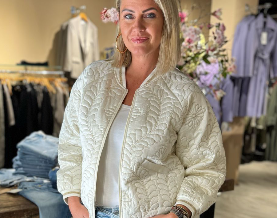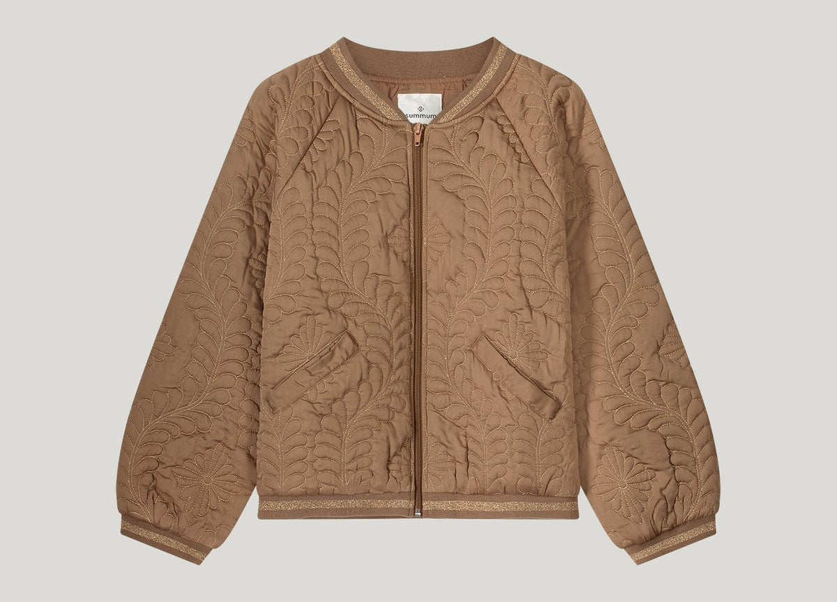 Dit gewatteerde bomberjack is gemaakt van satijn en gevoerd met katoenvoile. Het gouden lurex draad en botanische patroon geven het jasje een luxe touch.
