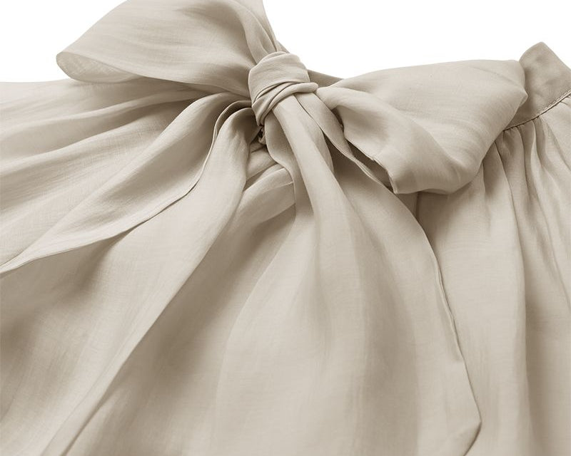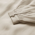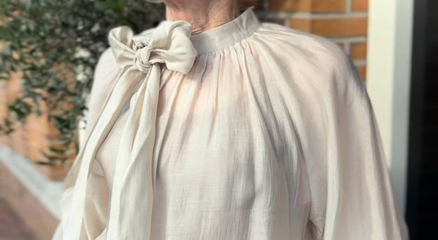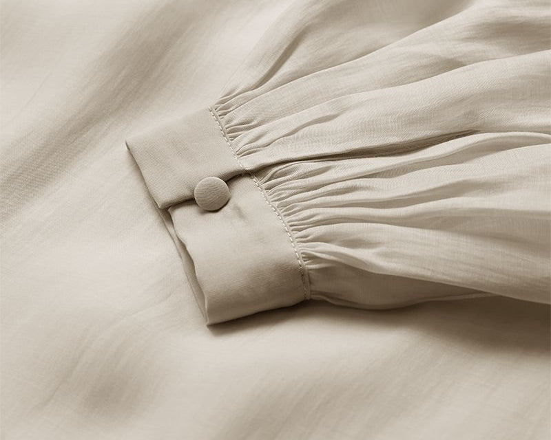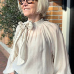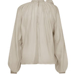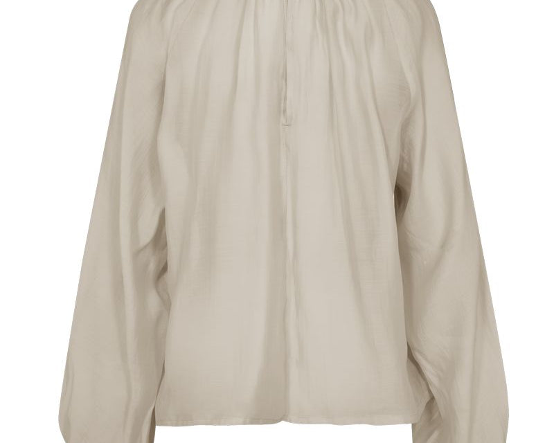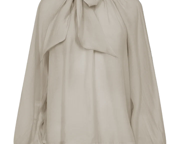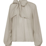 CMTILLY-BLOUSE is een blouse van een exclusieve kwaliteit met een extravagante, afneembare strikdetail aan de hoge kraag, plooidetails, een split met stoffen knoopjes op de rug, en lange raglanmouwen met een volumineus balloneffect en knoopsluiting.