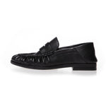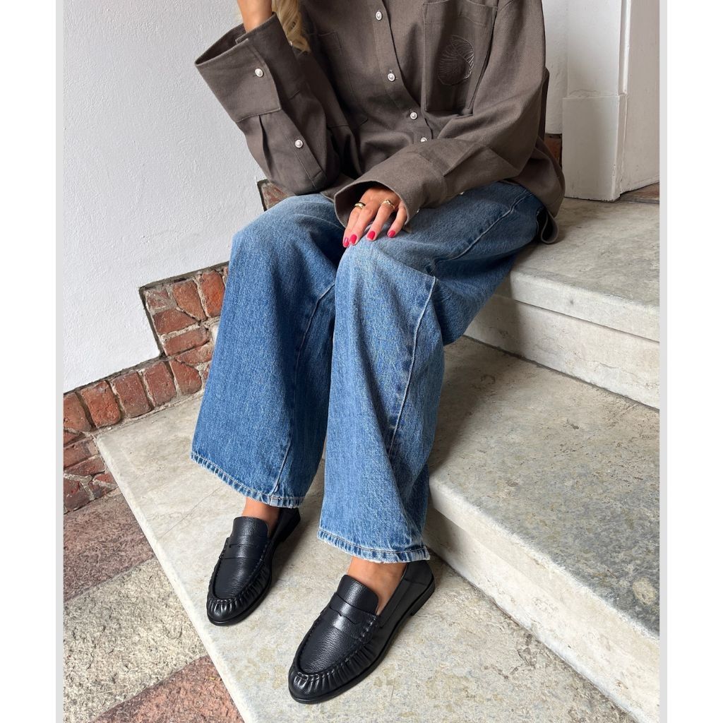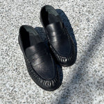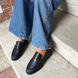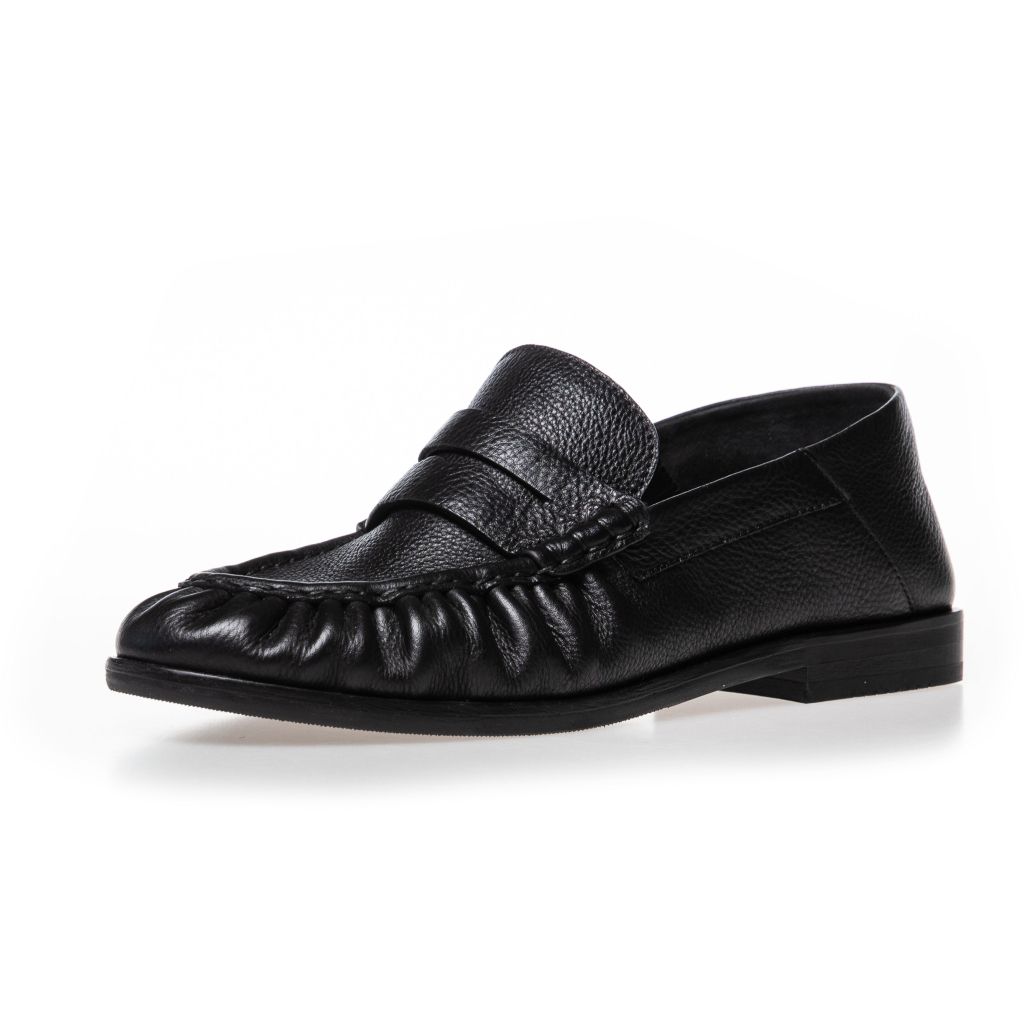 Een moderne loafer van zacht zwart leer met elegante gerimpelde details die het model een unieke en vrouwelijke uitstraling geven. De gladde penny-strap op de wreef maakt het stijlvolle ontwerp compleet.