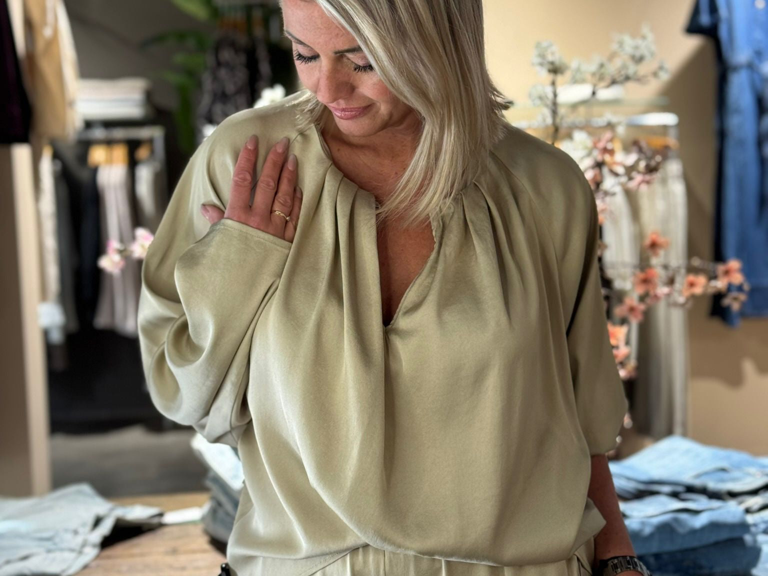 HARLEEN is een feestelijke blouse in klassieke lengte. De geplooide ronde halslijn benadrukt het vrouwelijke karakter van het model. Ze is gemaakt van zacht glanzend satijn, dat uitblinkt door zijn soepel vallende stof.