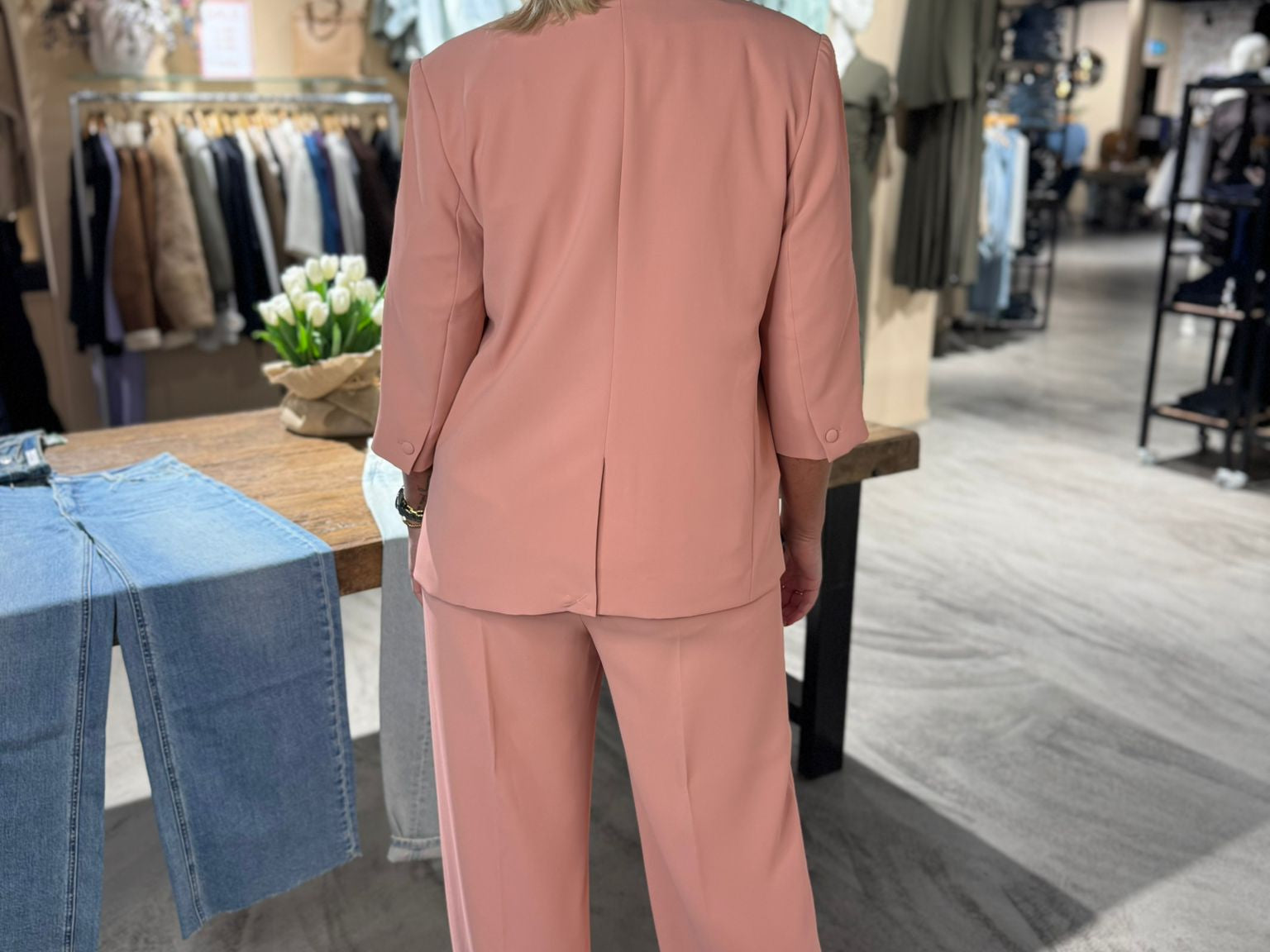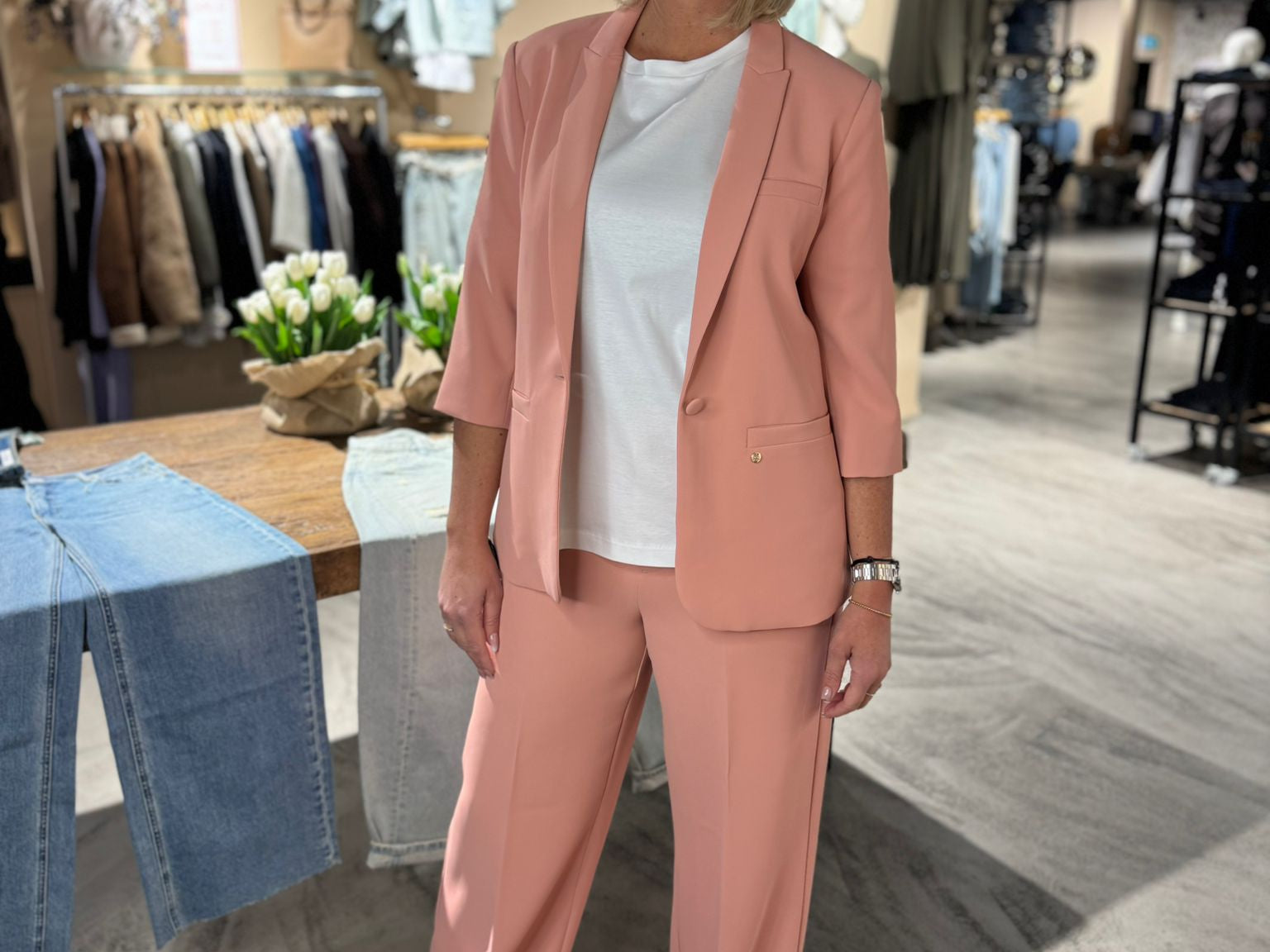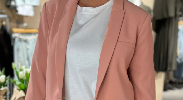 Prachtige blazer met gave 3/4 mouw in een mooie peachy kleur. Combineer met de Junie Miley pantalon om een pak te maken.