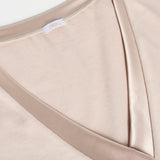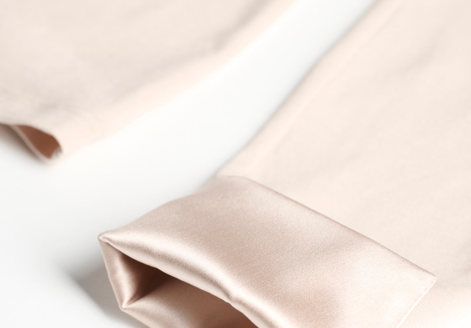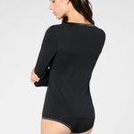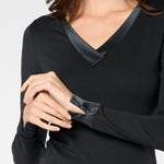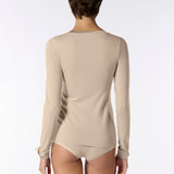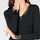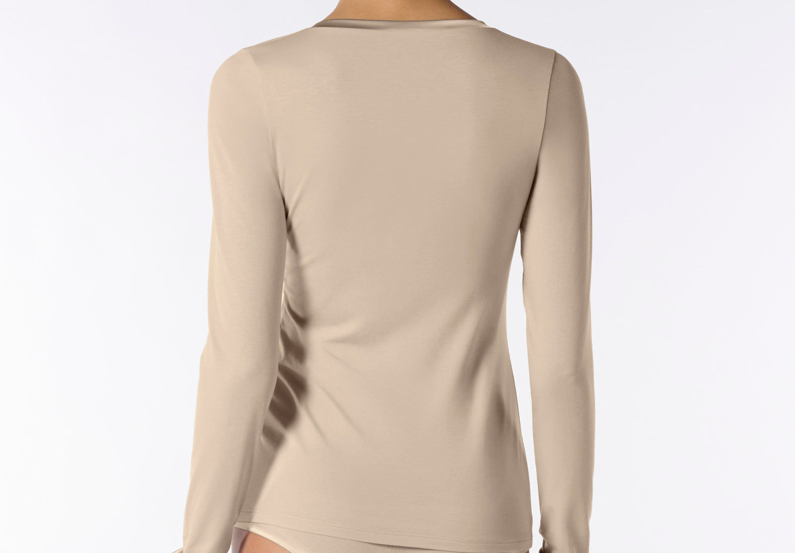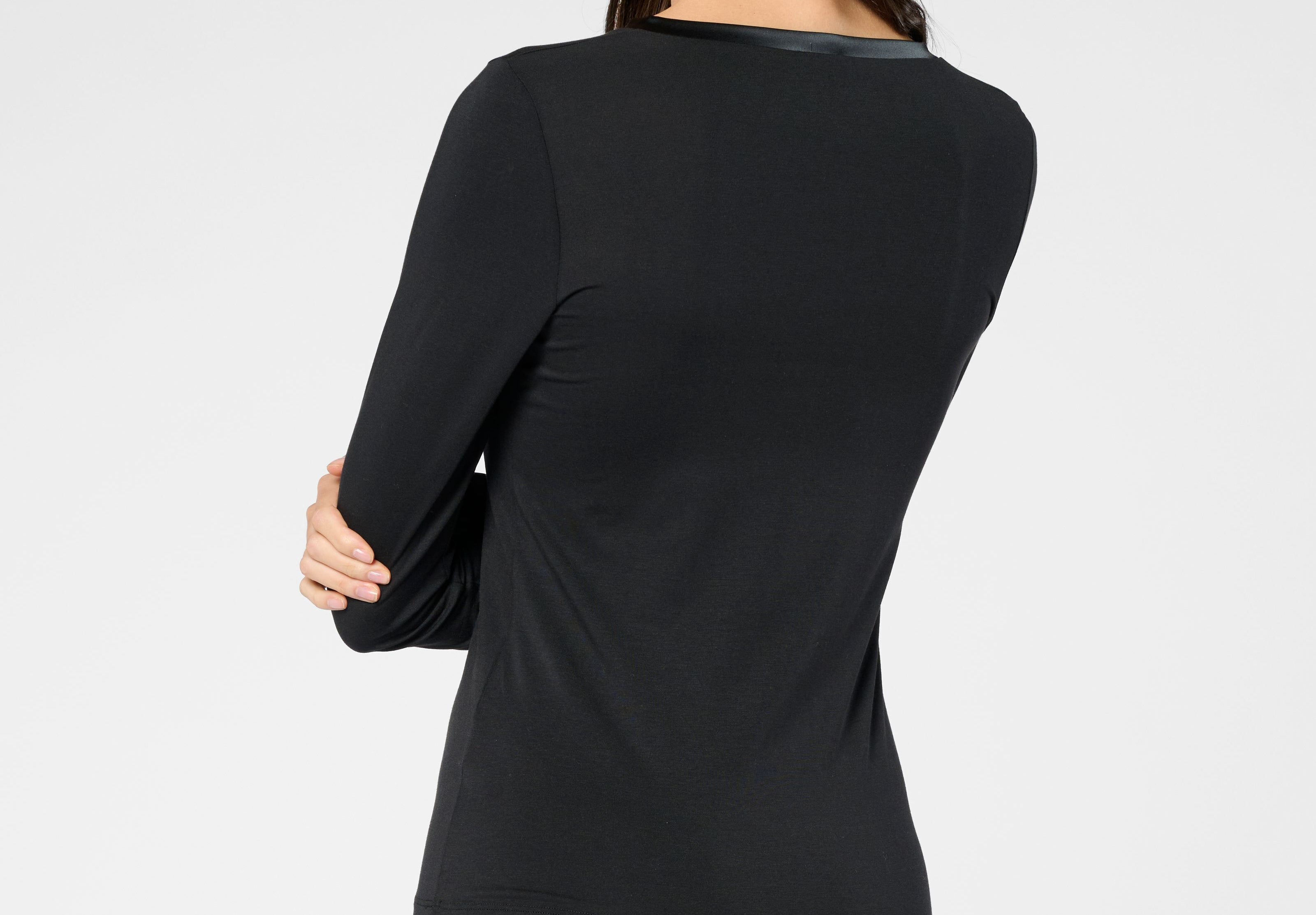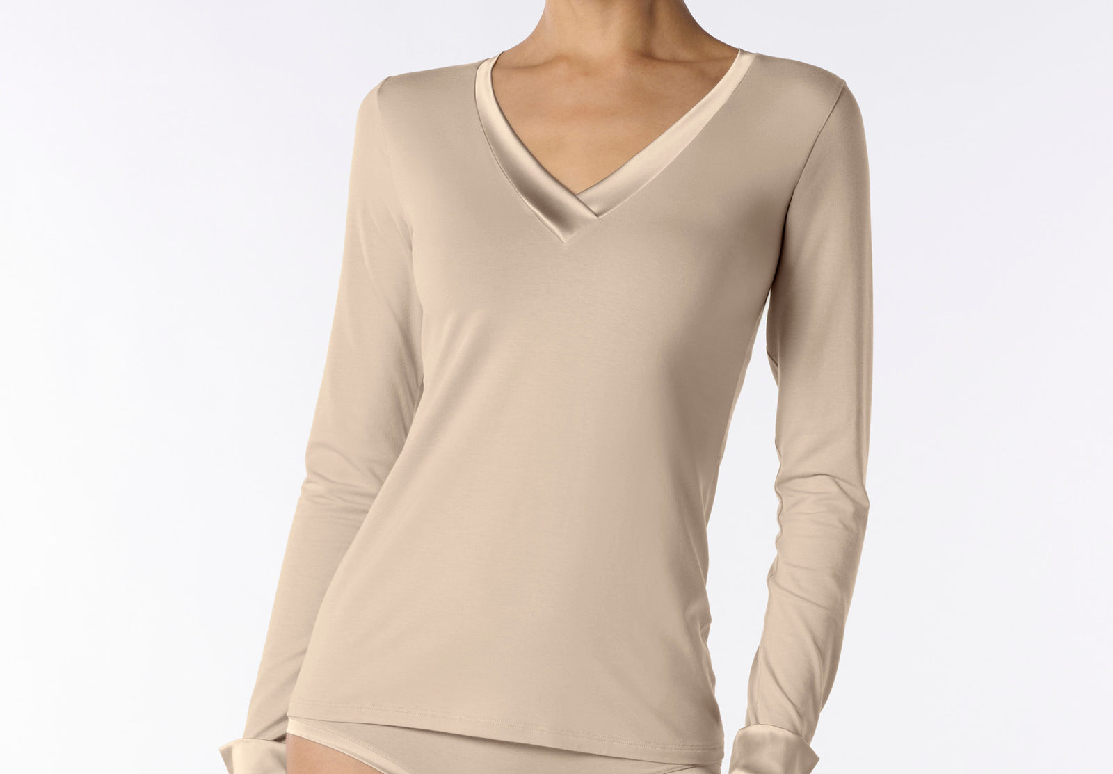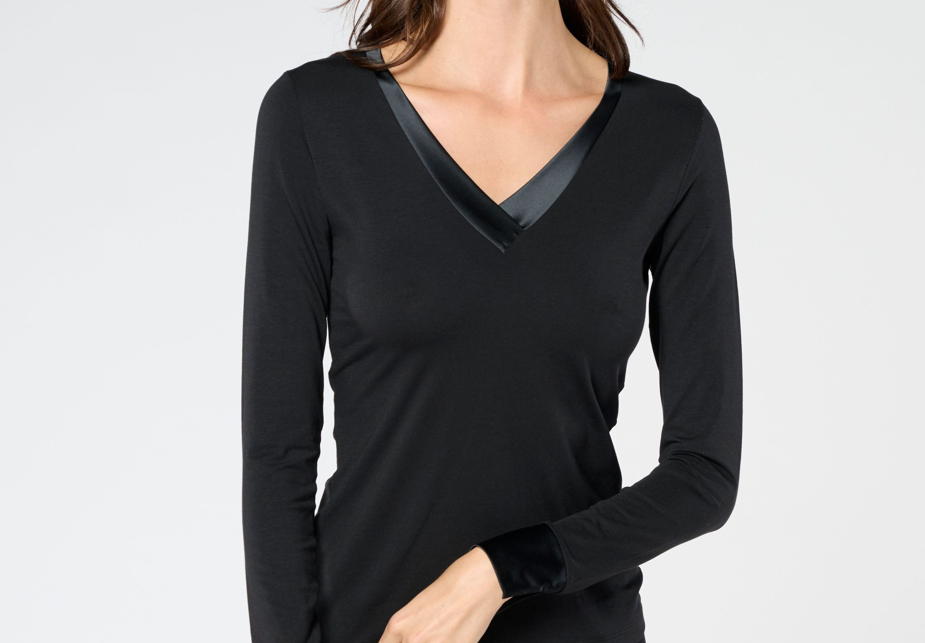 T-shirt met lange mouwen gemaakt van modal katoen, een natuurlijk, ademend en tegelijkertijd zacht en zijdeachtig materiaal. De V-hals van het shirt is afgezet met een satijnen rand.