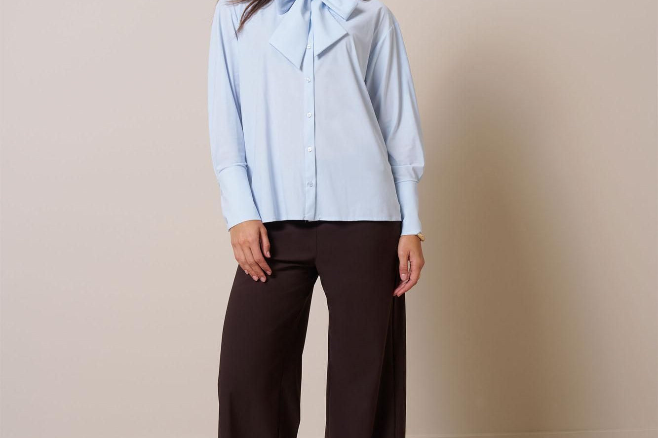 De Hollis top van Studio Anneloes geeft elke outfit een vrouwelijke en elegante upgrade. Met het speelse strikdetail bij de hals en de flatterende pofmouwen straal je moeiteloze klasse uit. Dankzij de Light Travelstof voelt deze top luchtig aan en blijft hij de hele dag mooi in vorm.