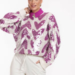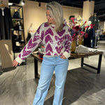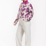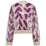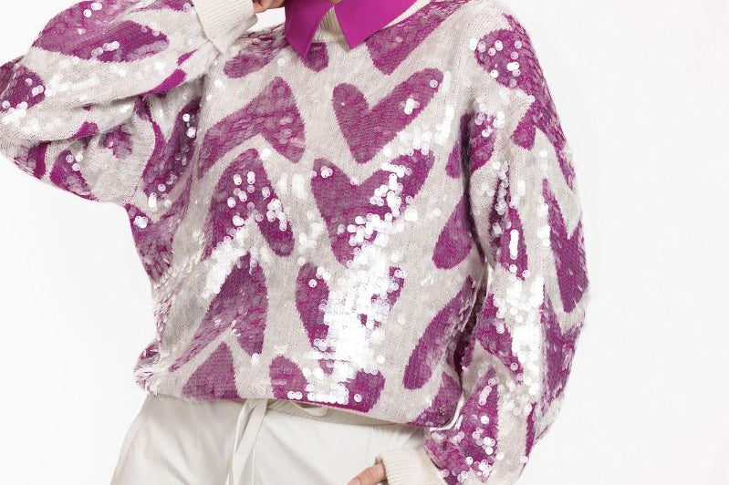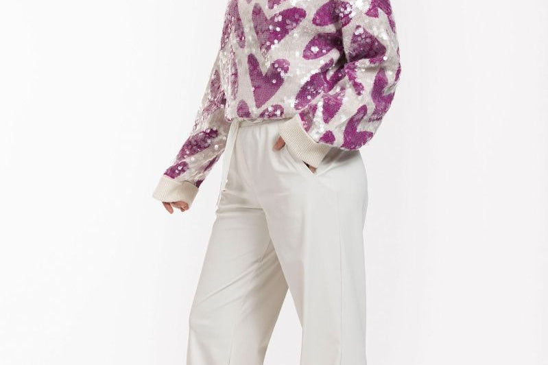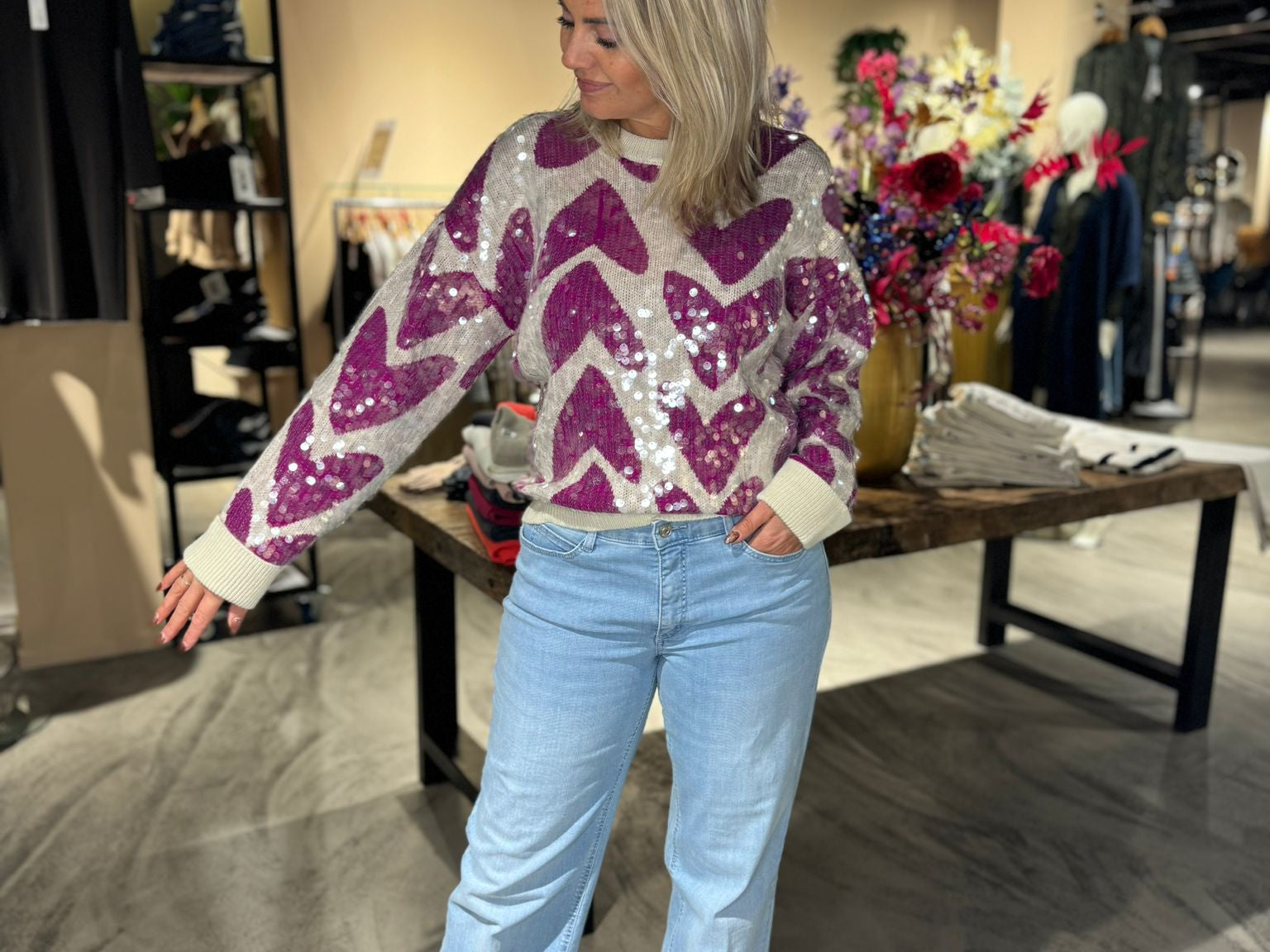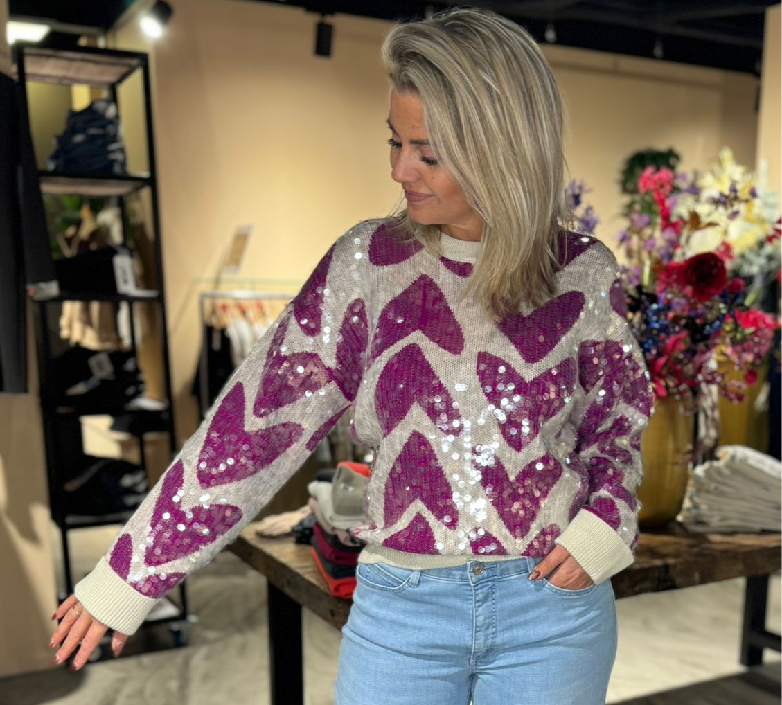 De Noah Heart Pullover - Kit/Magenta is één van de stijlvolle items uit de Elegant Encounters collectie van Studio Anneloes. Deze gebreide trui charmeert met zijn hoge ronde hals en lange mouwen. De geribde boorden geven het geheel een klassieke touch, terwijl de hartenprint met pailletten voor een speels en uniek effect zorgt. Een prachtige toevoeging aan uw garderobe.