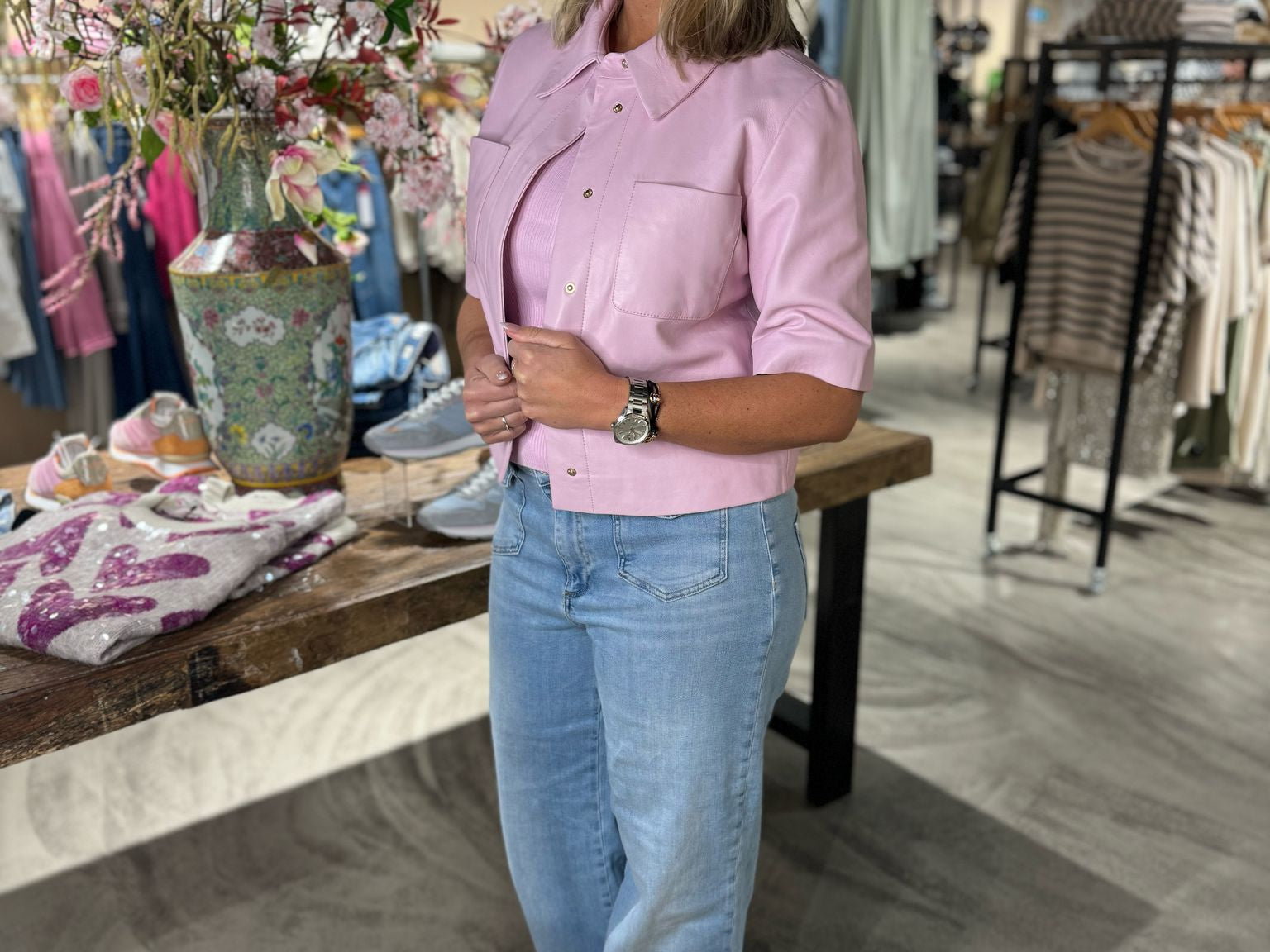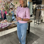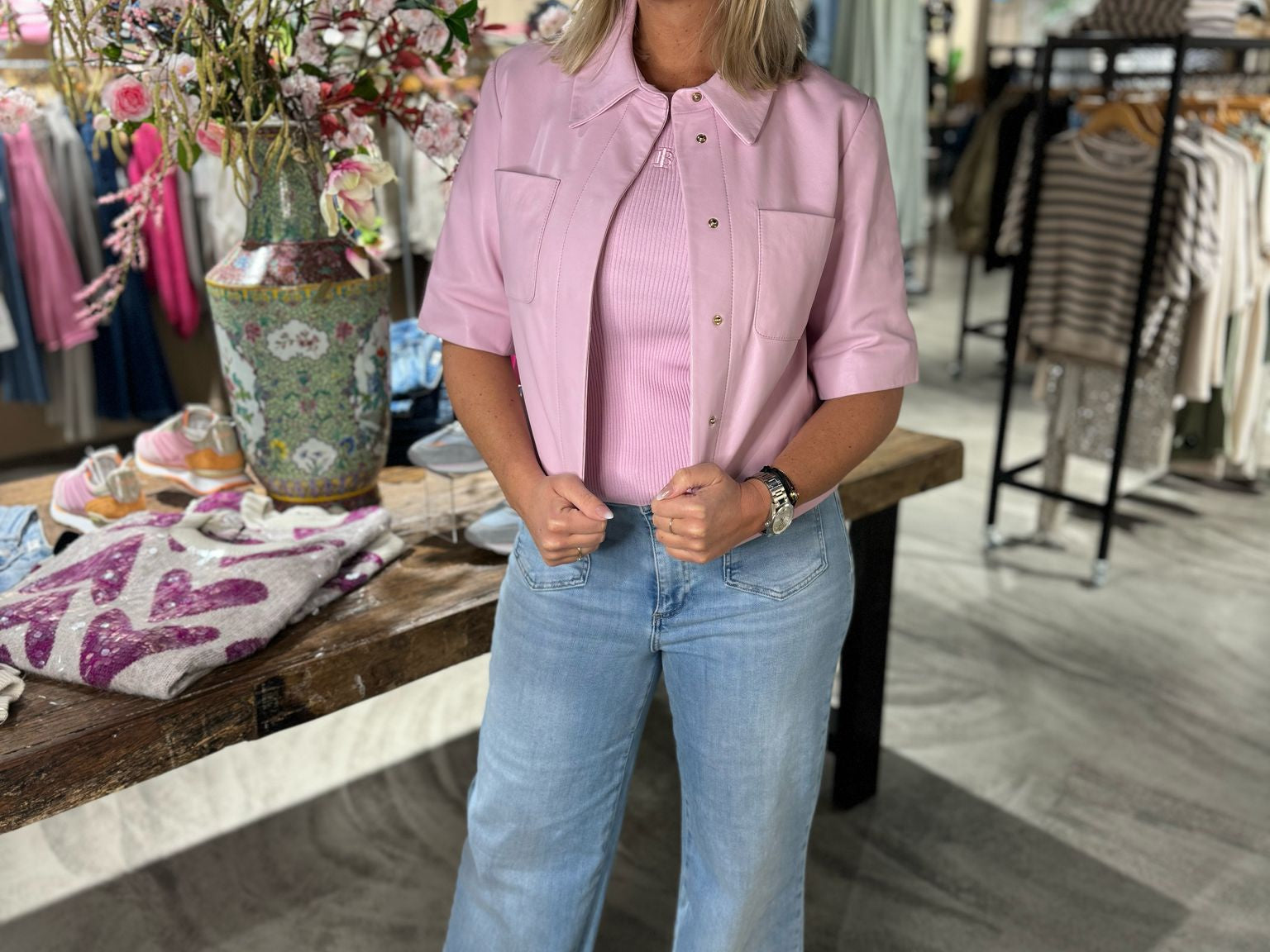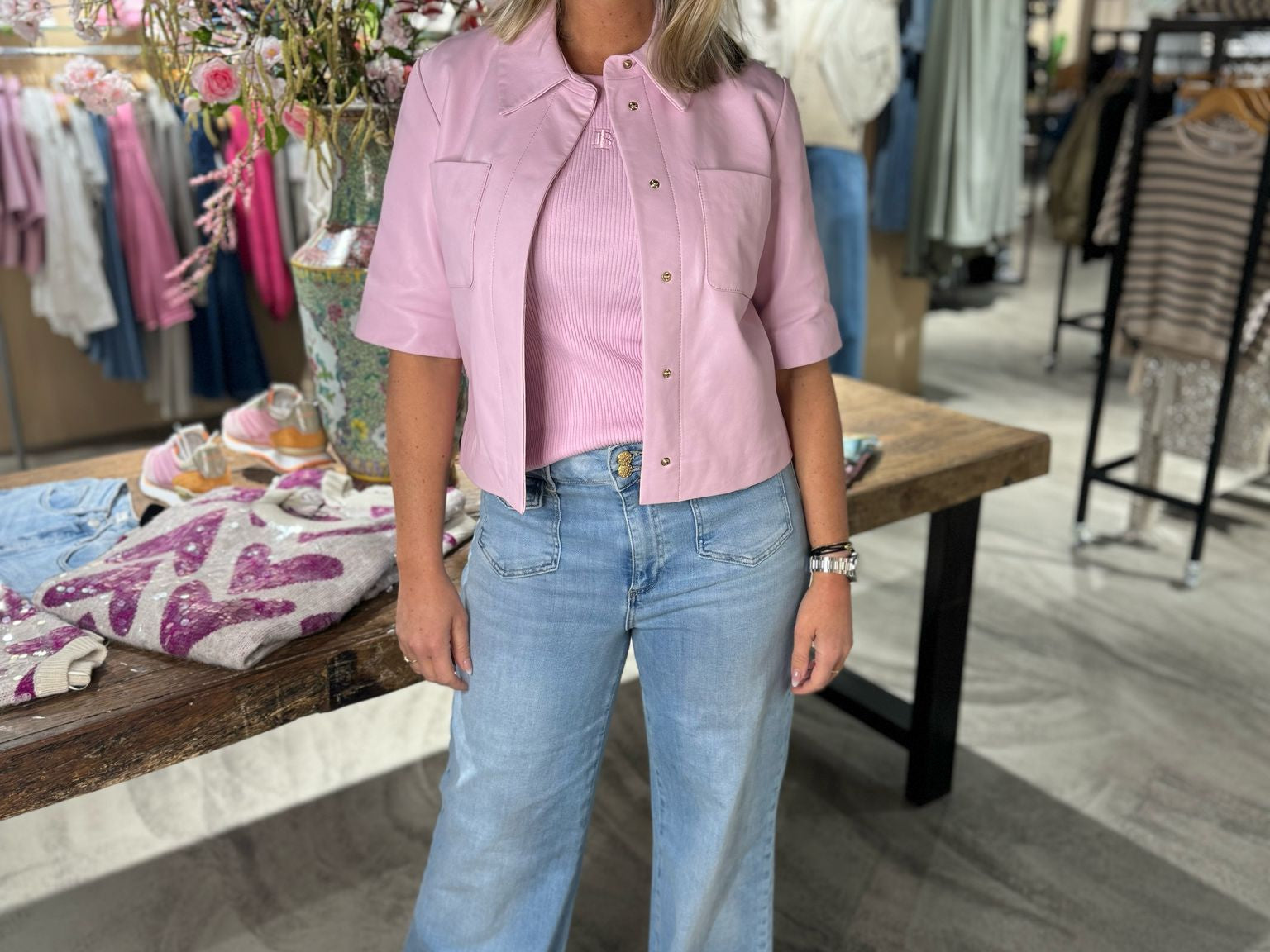 Dit is de Treabhar Top in de kleur Pinka. Deze top heeft een boxy fit met korte mouw, twee borstzakken en een blinde sluiting met drukknopen. De top is gemaakt van hoogwaardig non-stretch kwaliteitsleer.