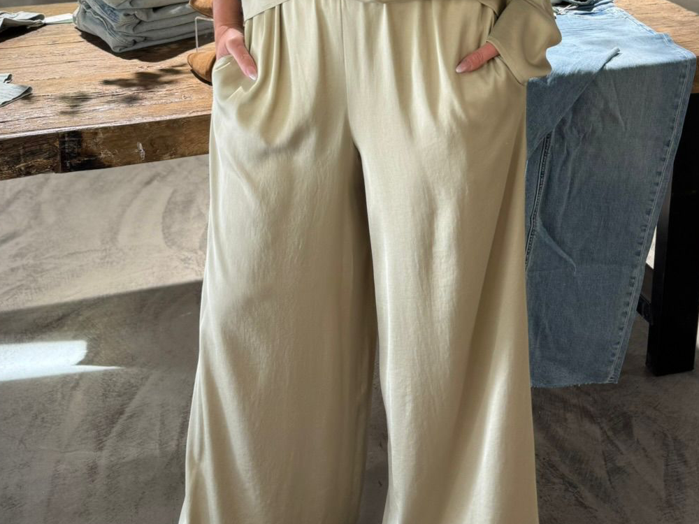 TWEEZER is een wijde broek met elastische tailleband. De casual pasvorm wordt mid-waist gedragen. Gemaakt van een hoogwaardige en vloeiende satijn.